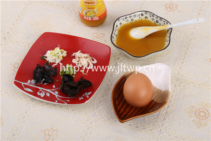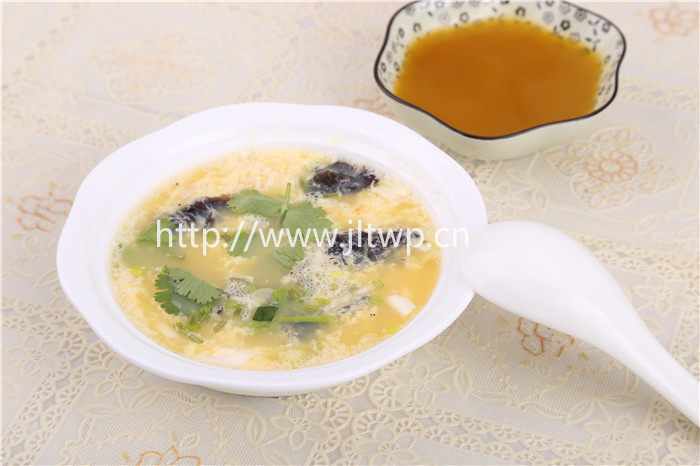 2.稱量40g雞汁,加入1Kg開水,燒開后倒入打散的雞蛋,邊倒邊攪,燒開30秒后停火,將蛋湯倒入湯碗中;
