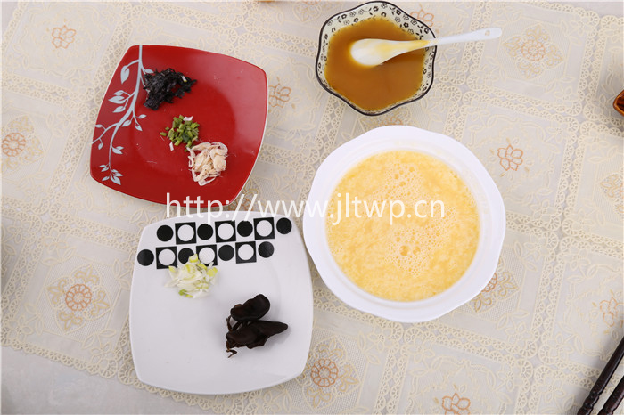 1.將雞蛋打碎加入0.5g食鹽,打散;稱量10g香蔥、4g香菜備用;