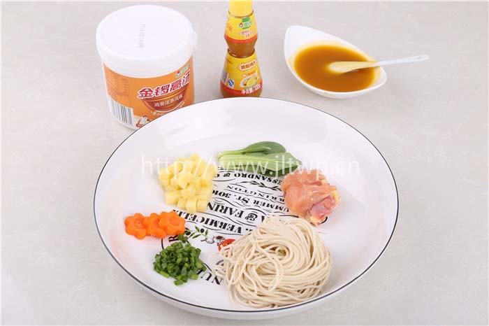 1.雞塊過油炒熟或清水煮熟,小油菜燙熟,土豆切丁后煮熟備用;